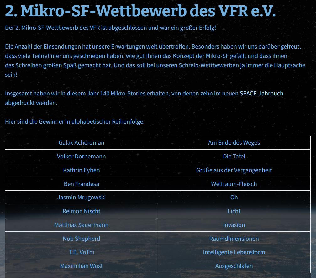 „Weltraum-Fleisch“ als einer von zehn Gewinntertexten des 2. Mikro-SF-Wettbewerb des VFR e.V., Abdruck im SPACE-Jahrbuch (2022)