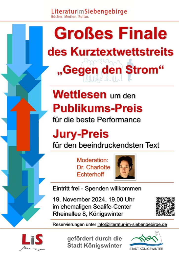 Einladung zur Lesung des Kurztextwettstreits „Gegen den Strom“ am 19. November 2024 in Königswinter im Rahmen des Literatur-Wettbewerbs „Literatur im Siebengebirge“.
